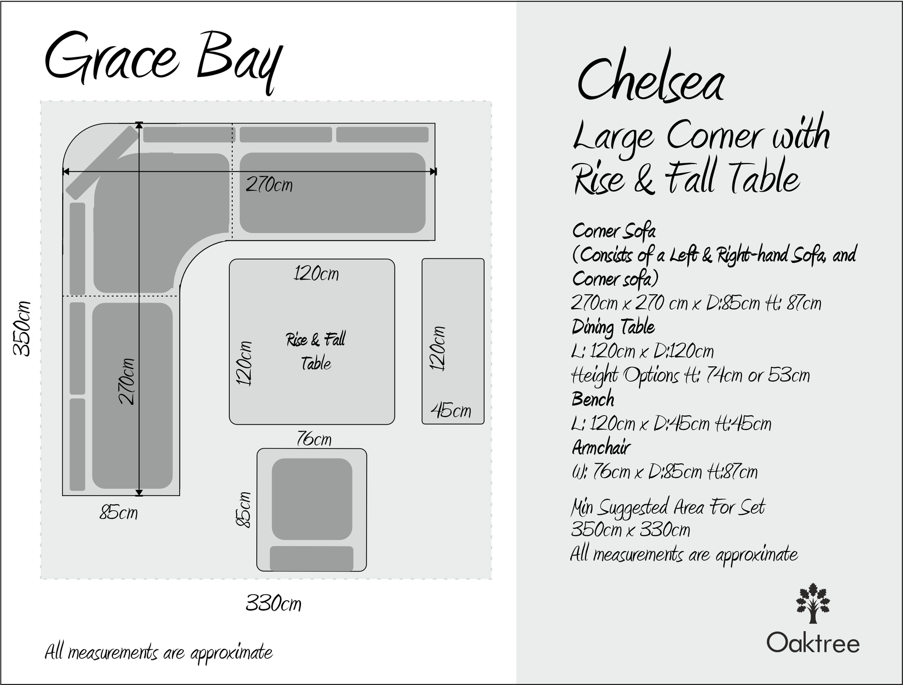 The Chelsea Large Outdoor Corner Sofa Dining Lounging Set offers luxurious seating for your garden. Complete with a corner sofa, two benches, and a versatile RISE & FALL table, this set is perfect for both dining and lounging with loved ones.