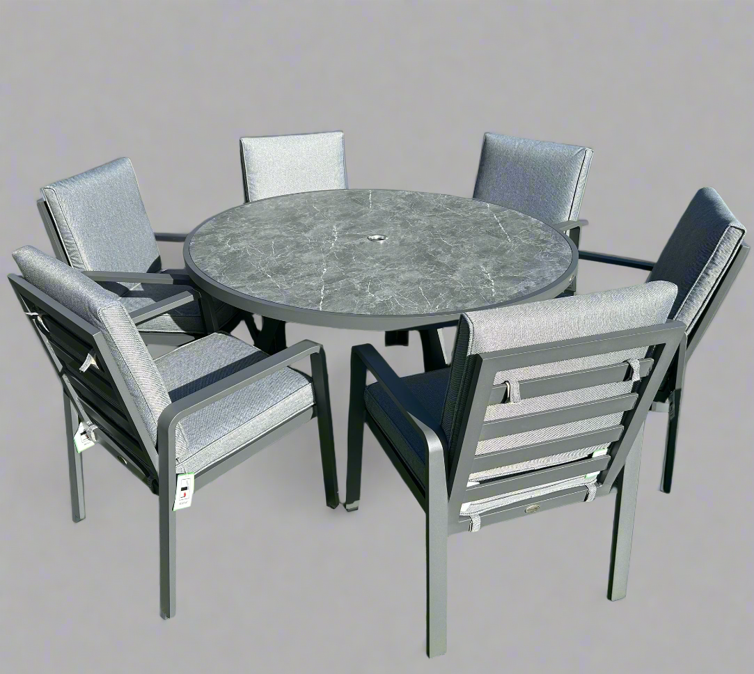 Enjoy the ultimate comfort with six stunning dining armchairs, all with back and seat cushions, surrounding the 140cm round table with its beautifully designed marbled-effect glass top and sturdy aluminium frame.