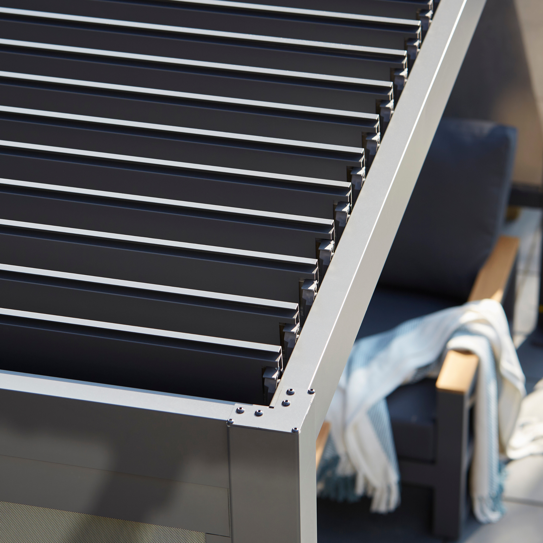 Water-resistant, the pergola louvres can be closed for shelter from the elements or open to enjoy the sunshine.